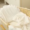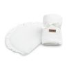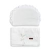 Sensillo sengesett til barnevogn/vugge er et elegant hvitt sett som består av en pute og et lett teppe. Den ene siden av settet er laget av bomull med sjarmerende og delikat engelsk broderi. Den andre siden er av myk plysj som vil omfavne babyen behagelig. Puten er fylt med lett, antiallergisk silikonfiberstoff som ikke beveger seg under bruk. Teppet har ikke noe ekstra fyll, det er lett og plysjlaget gir tilstrekkelig beskyttelse mot kulde.
